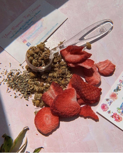 This darling blend is a gorgeous combination of organic *Dried Chamomile flowers, *Dried Lemon, *Dried Strawberries & *Dried Basil. So light and refreshing. Awesome "After dinner sip with dessert" tea.