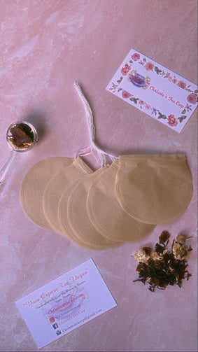 Chrissie's Tea Cup all natural, drawstring loose tea bag filters are made of natural wood pulp. Which is unbleached, non toxic and processed by UV sterilization and infrared drying.